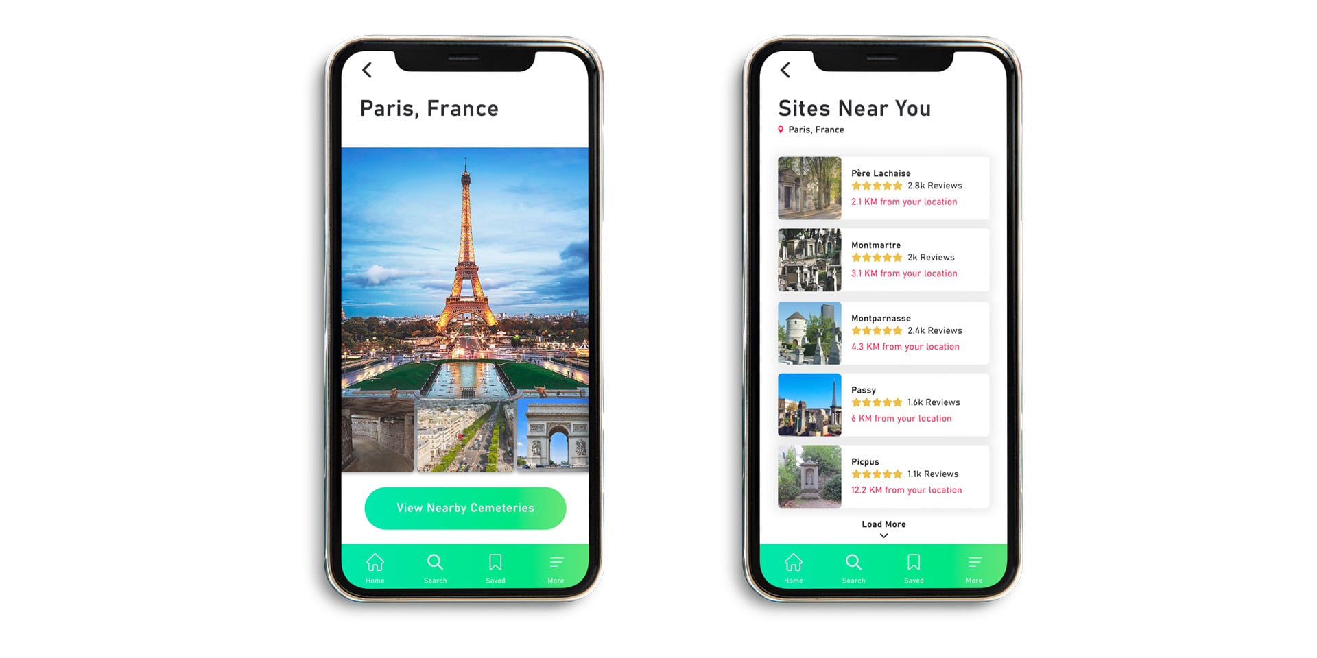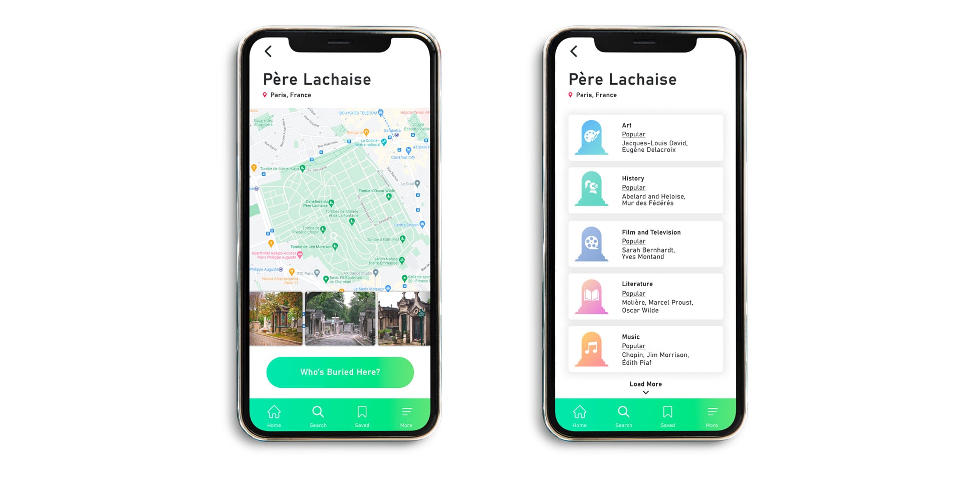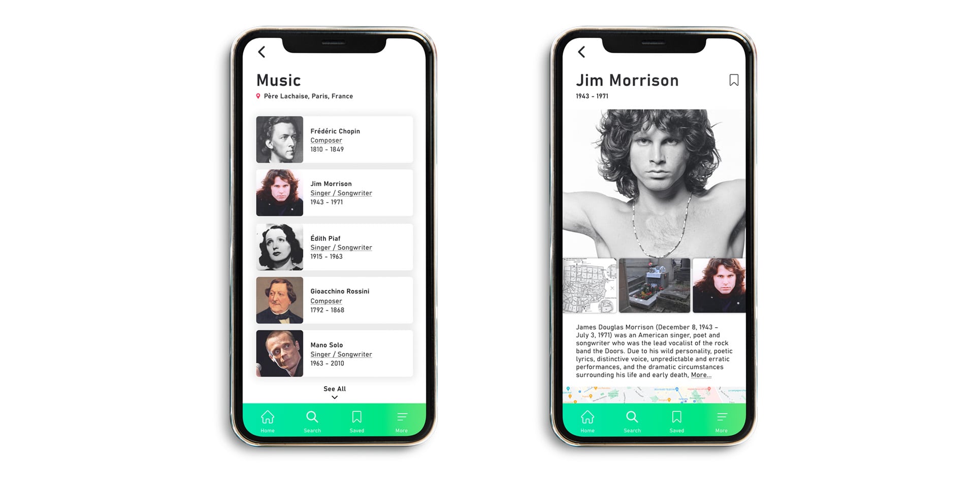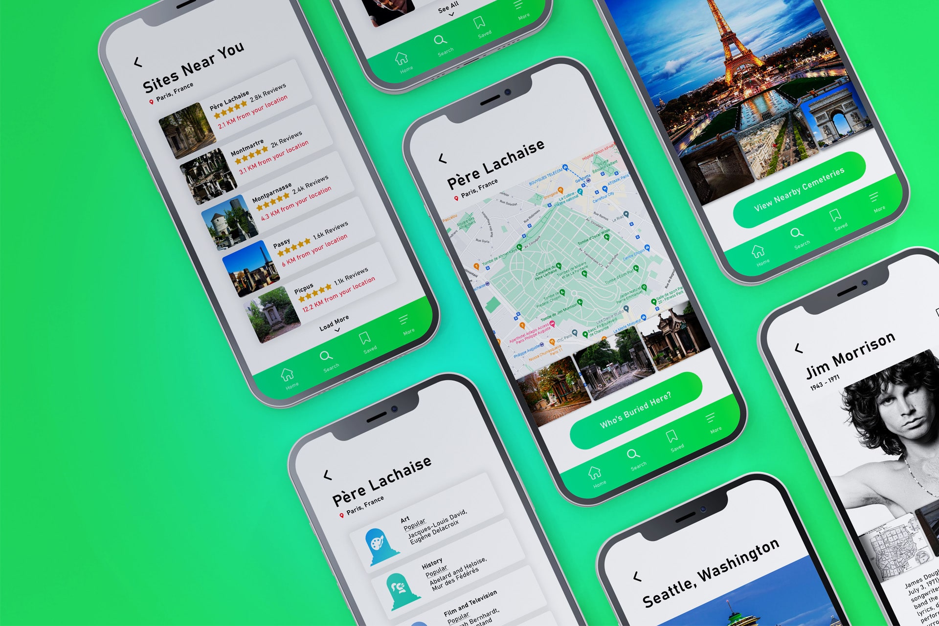A mobile travel app highlighting noteworthy burials in cemeteries around the world.