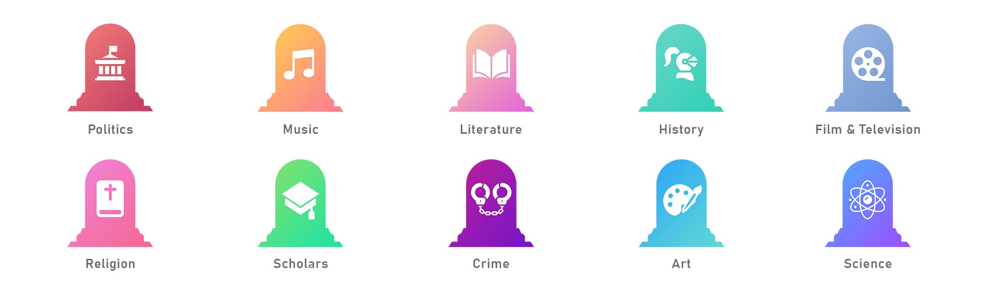 - Lists notable burials categorized by industry or contribution (Music, Film, Art, Literature, etc.).